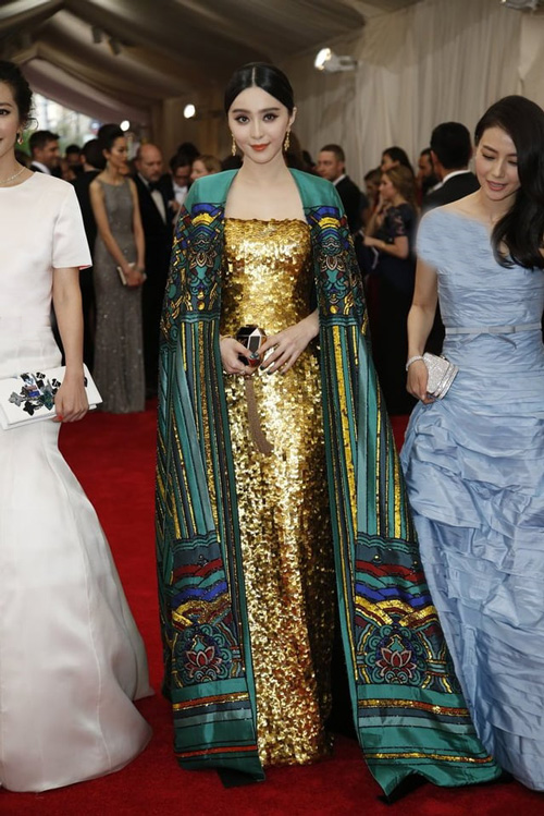 فن بینگبینگ، ستارهی مشهور و بینالمللی چین، با استایلی اصیل و فاخر روی فرش قرمز مت گالا ۲۰۱۵ درخشید. او پیراهن ماکسی طلایی و شنل سبز باشکوهی از طراحیهای Christopher Bu به تن داشت که با جزئیات و طراحی الهامگرفته از لباسهای امپراتوری چین، جلوهای شاهانه و فرهنگی به استایلش داده بود و یکی از کاملترین بازتابهای تم شب به شمار میرفت.