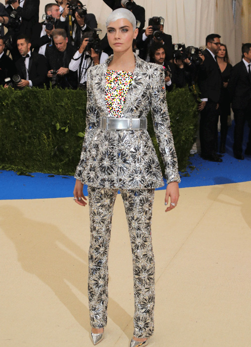 این مدل بریتانیایی، با کتوشلوار نقرهای متالیک از برند «شنل» روی فرش قرمز ظاهر شد، اما نکتهی جالب استایلش سر تراشیده و رنگآمیزی شدهی نقرهایش بود. این انتخاب جسورانهی او، نشاندهندهی پذیرش مفاهیم تغییر ظاهر و شکستن انتظارات بود، درست در راستای دیدگاههای ری کاواکوبو.