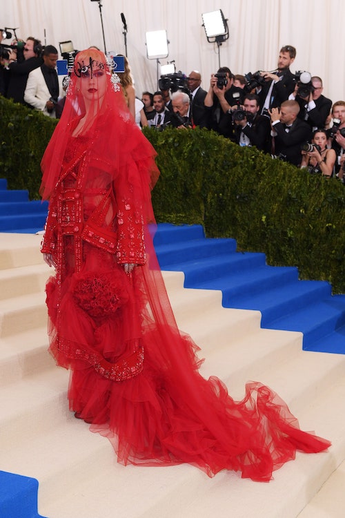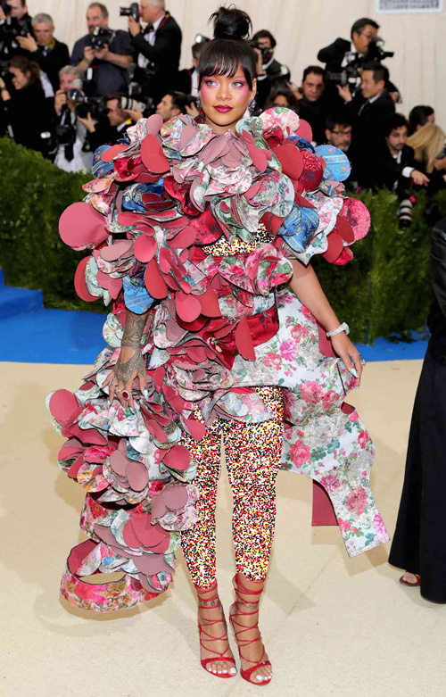 این خوانندهی باربادوسیتبار، یکی از درخشانترین چهرههای این مراسم بود. او با لباسی مجسمهوار از کالکشن «Comme des Garçons»، بهشکل فوقالعادهای مفهوم هنر از دیدگاه ری کاواکوبو را به نمایش گذاشت. لباس او با ساختاری چندلایه، پر از حجمهای نامتقارن و پارچههای رنگارنگ، از موفقترین تفسیرهای این تم به شمار میرفت.