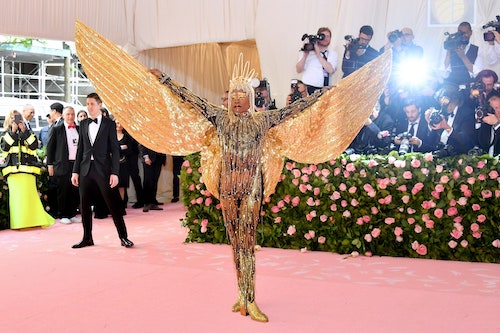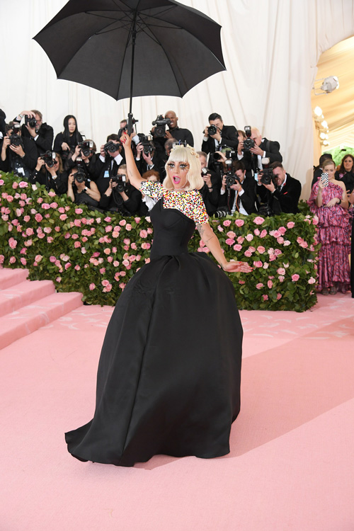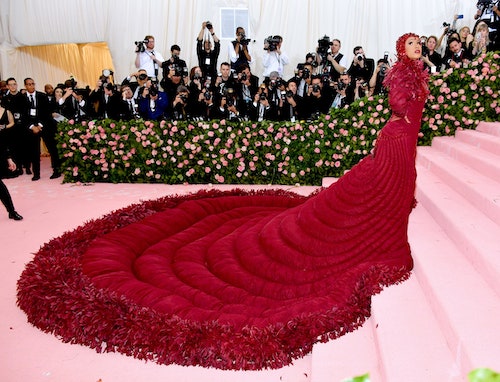این خواننده با لباسی از برند «تام براون» به رنگ قرمز خونی که دامنی دایرهایشکل و حجیم با پوششی شبیه شنل سلطنتی داشت، بهوضوح مفاهیم قدرت، اغراق و نمایش را به نمایش گذاشت و یکی از ماندگارترین لوکهای تاریخ مت گالا را ساخت.