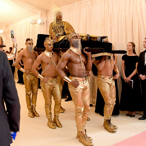 این خواننده و بازیگر جسور، با لباسی الهامگرفته از مصر باستان، سوار بر تختی طلایی و با شش مرد نیمهبرهنه که او را حمل میکردند، وارد مراسم شد. او بالهایی طلایی، تاج و استایلی فوقالعاده نمایشی داشت که از نظر نمادگرایی و اغراق، بینظیر بود.