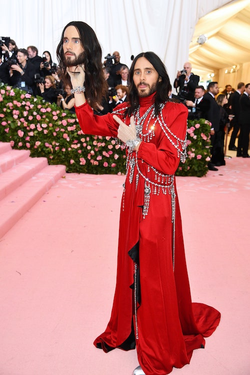 این ستارهی مشهور و جسور، با لباسی از برند «گوچی» و همراه با نسخهی کاملاً واقعی و وحشتناک از سر خودش، مرزهای عادت را شکست و وارد حیطهی سوررئال و نمایشی کمپ شد.