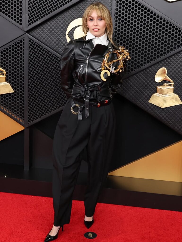 در Grammy Awards ۲۰۲۶، مایلی سایرس بار دیگر ثابت کرد که لباس و استایلش به اندازه موسیقی‌اش خبرساز است. به‌جای پیراهن‌های پرزرق‌وبرق معمول، او برای فرش قرمز یکی از جسورانه‌ترین ظاهرهای شب را انتخاب کرد: یک ست سفارشی از سلین (Celine) شامل کت چرمی مشکی موتو، شلوار پرچین (balloon pants) و پیراهن سفید کلاسیک که با جزئیات دقیق طراحی شده بود.