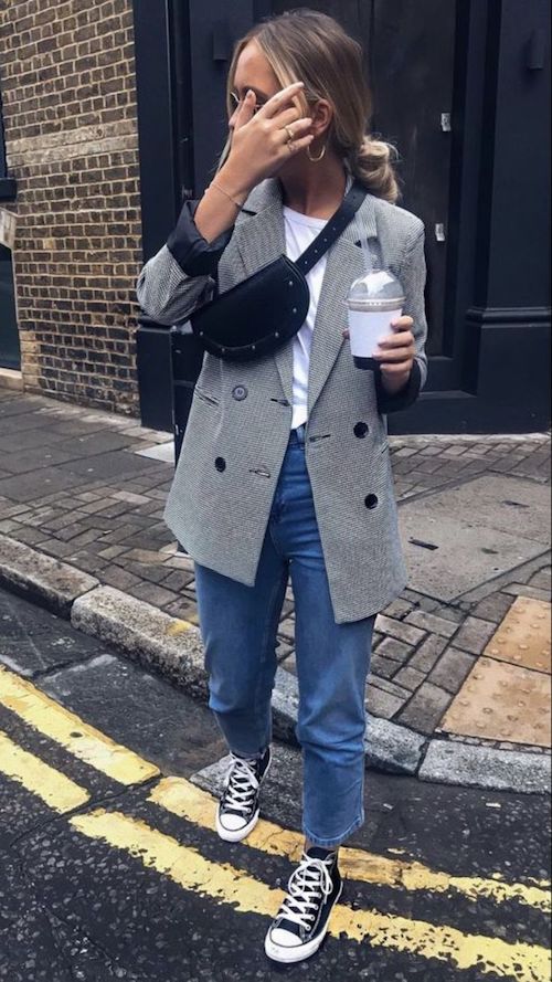 2. کت بلیزر طوسی روشن + تی‌شرت سفید + شلوار جین آبی کلاسیک