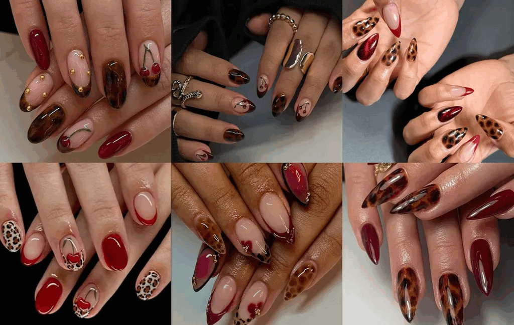اگر می‌خواهید یک رنگ لاک پاییزی ترند را در روزهای سرد این فصل امتحان کنید پیشنهاد ما به شما مدل لاک قرمز به همراه طرح‌های پلنگی است. ترکیب پترن قهوه‌ای مشکی پلنگی با رنگ قرمز جیغ یا شرابی بهترین طرحی است که می‌توانید داشته باشید. برای اینکه ناخن‌هایتان زیباتر شود می‌توانید این طرح‌ها را با جزئیات طلایی یا لاک‌های قرمز چشم گربه‌ای و شاین‌دار ست کنید.