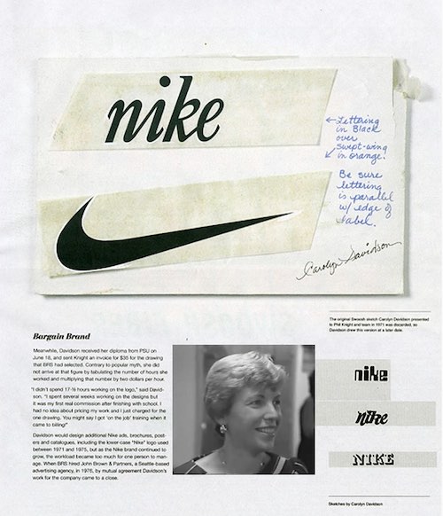 در سال ۱۹۷۱، فیل نایت، صاحب برند و شرکت «نایکی»، سفارش طراحی لوگوی برندش را به کارولین دیویدسون داد. کارولین که این روزها ۸۲ سال دارد، در آن زمان ۲۷ ساله بود و به صورت پروژهای با برند «نایکی» و دیگر برندها کار میکرد. کارولین به عنوان طراح لوگوی «نایکی»، طرحهای مختلفی را اجرا و ایدههای متنوعی را ارائه کرد. در نهایت لوگوی تیک مانند «نایکی» به تایید فیل نایت رسید و امروزه به عنوان یکی از قدرتمندترین و به یاد ماندنیترین لوگوها شناخته میشود. این لوگو نمادی از حرکت، سرعت و موفقیت شده است و جایگاه وسیعی در سراسر جهان دارد.