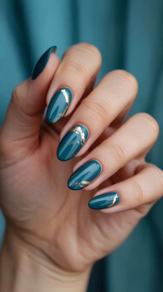 ترکیب سبز عمیق با فلزات درخشان، به ویژه طلای زرد، بیشک میتواند یکی از اصیلترین ترندهای سال 2026 محسوب میشود. استفاده از ورق طلا به صورت نامنظم بر روی یک یا دو ناخن، یا ترسیم خطوط بسیار نازک و هندسی با لاک طراحی طلایی، جلوهای سلطنتی به این رنگ میبخشد. دقت داشته باشید که برای ناخن رنگ سال 2026، حفظ سادگی کلید اصلی زیبایی است؛ بنابراین بهتر است از شلوغ کردن تمام ناخنها پرهیز کرده و تمرکز را بر روی جزئیات ظریف بگذارید.