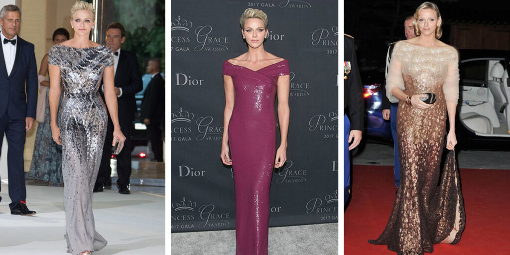 پیراهنهای مجلسی شارلین اغلب در طیف رنگهای خنثی، سفید، نقرهای، سرمهای یا مشکی انتخاب میشوند، با پارچههایی فاخر مانند ابریشم، کرپ یا ساتن مات که بر کیفیت دوخت و فرم تأکید دارند. او معمولاً از طرحهای یکطرفه، یقههای قایقی یا غیرقرینه بهره میگیرد که به زیبایی با فرم اندام او هماهنگ است و نوعی ظرافت بیصدا اما تأثیرگذار را به نمایش میگذارد. در کنار انتخاب لباس، پرنسس شارلین به سادگی در اکسسوریها نیز وفادار است. او به ندرت از جواهرات بزرگ یا شلوغ استفاده میکند و اغلب گوشوارههای مینیمال، گردنبندهای ظریف یا گاهی فقط یک دستبند ساده را برای تکمیل ظاهرش برمیگزیند. مدل موهای کوتاه یا بسته، آرایش ملایم و حالت چهرهی همیشه آرام و باوقار، ظاهر مجلسی او را کامل میکند. طراحان مشهوری مانند آرمانی، رالف لورن و آکرمن، بارها لباسهایی منحصربهفرد برای او طراحی کردهاند که در مراسمهایی مانند جشنهای سلطنتی، فرش قرمز یا مهمانیهای رسمی در کاخ موناکو، درخشش و وقار خاص او را برجستهتر کردهاند. استایل شارلین نه تنها بازتابی از سلیقه شخصیاش، بلکه نوعی تعریف جدید از لباس شب سلطنتی در قرن ۲۱ است.