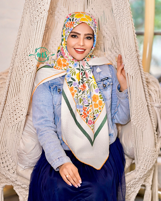 روسری ابریشم ژاکارد طرح زنجیری رنگ مشکی کرم
