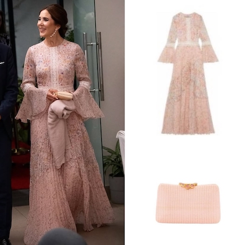 در پایان روز دوم، در مراسم شام رسمی، ملکه مری پیراهنی بلند از «Mikael Aghal» با پارچهای چیندار، گلدار و تزیینات تور به تن داشت. این لباس با کیفدستی کوچک صورتیرنگ تکمیلشده بود؛ انتخابی زنانه، لطیف و کاملا مناسب برای یک شام دیپلماتیک.