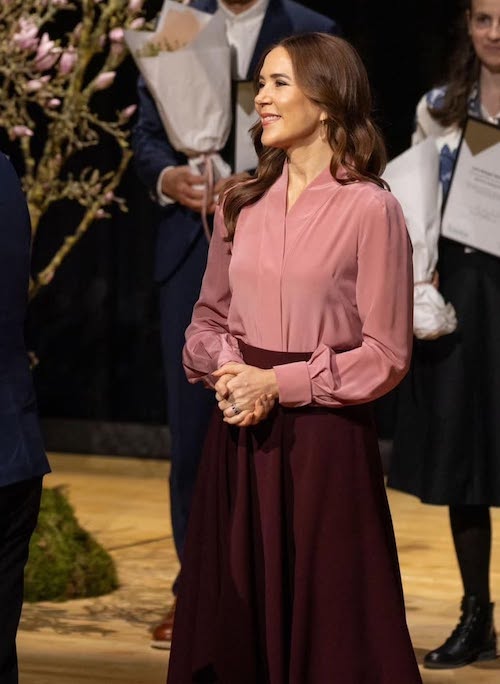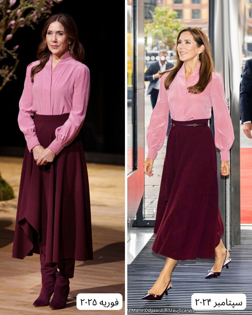 مری که به انتخابهای هوشمندانه در مد مشهور است، از ترکیب قطعاتی از مارکهای بریتانیایی، از جمله «فولد» و «الکساندر مککوئین» استفاده کرد. مری در این مراسم، یک بلوز آستینبلند صورتی کمرنگ از مارک «فولد» پوشید و آن را با یک دامن نامتقارن شرابیرنگ از برند «الکساندر مککوئین» و یک جفت چکمه جیر همرنگ هماهنگ کرد. او این بلوز را تابستان قبل با یک دامن ساده و کفشهای پاشنه گربهای تابستانی پوشیده بود و این بار با آرایش و مدل موی یکسان، دامن «مککوئین» را جایگزین دامن قبلی که برشی ساده داشت، کرد. این ترکیب رنگی گرم، انتخابی ایدهال برای گذار از زمستان به بهار است که شما هم میتوانید آن را امتحان کنید.
