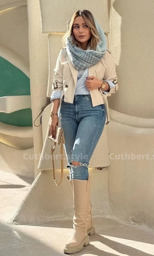 ترنچ کت کوتاه با شلوار اسکینی و بوت بلند