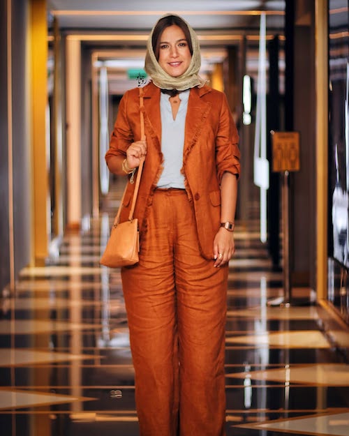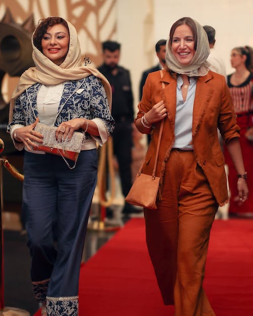 انتخاب او برای این مراسم، کت و شلوار نارنجیرنگی بود که با جسارت و انرژی خاصی در فضای رسمی مراسم خودنمایی میکرد. این رنگ گرم و پرجنبوجوش با روحیهی بهاری و فضای پرشور فیلم، همخوانی زیبایی داشت. با این حال، انتخاب پارچهای که بهوضوح چروک شده بود، باعث شد این ظاهر شیک با نکتهای منفی همراه شود. ترکیب این کتوشلوار با شومیز آبی آسمانی، تضاد رنگی جذابی ایجاد کرده بود که چشمها را به سوی خود میکشید. روسری توری بژ و کیف دوشی پرتقالیرنگ نیز با هوشمندی به این استایل افزوده شده بودند و ستاره را به یکی از درخشانترین چهرههای مراسم تبدیل کردند. این انتخاب رنگی، نشانی از جسارت و تمایز او در دنیای مد و استایل سینمای ایران دارد.