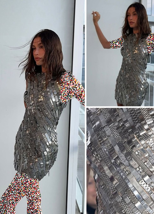 مارین سر (Marine Serre)، دیگر طراح زن پیشروی فرانسویتبار، در مجموعه پاییز ۲۰۲۵ خود، لباسی تماما از بندهای ساعت ارائه کرد. لباسی که هیلی بیبر در مراسم معرفی محصولات پوستیاش به تن داشت. این لباس نهتنها زیبا و خاص بود که حامل پیامی در باب زمان، ارزش و زیستپذیری نیز بود. سر، با نگاه ترکیبی به مد و سیاست، بر مسائلی چون نقش جنسیت، محیطزیست و پایداری تمرکز دارد.