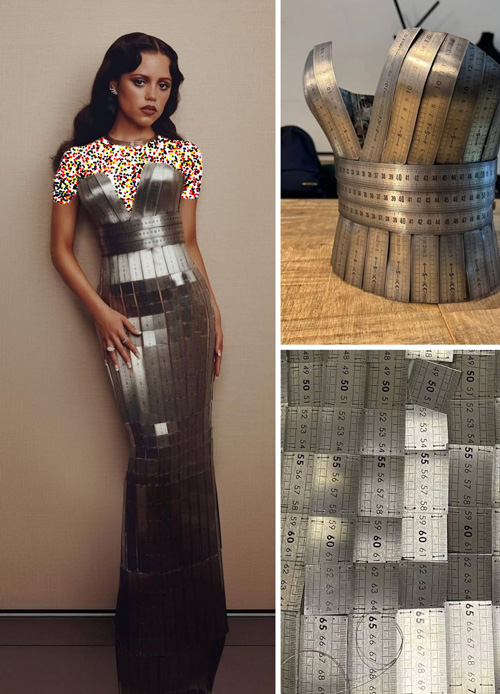 در نهایت، نمیتوان از لباس خاص جنا اورتگا در شبنشینی مد موزه متروپولیتن ۲۰۲۵ گذشت؛ طراحی اختصاصی اولیویه روستینگ برای برند «بالمن» و ساختهشده از خطکشهای فلزی. این لباس نهتنها خلاقانه، که ادای دینی بود به ابزار خیاطان و سازندگان الگو و درعینحال بازتاب کاربرد صنعتی مد در آینده.