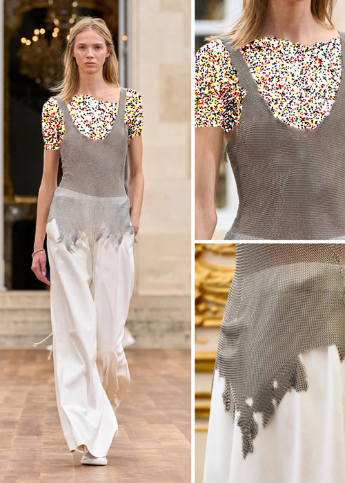در میان طراحان باتجربه نیز گابریلا هرست، با ترکیب سنتهای بومی آمریکای جنوبی و فرمهای زرهگونه، چشماندازی شاعرانه از قدرت زنانه ارائه میکند. لباس زنجیری (chainmail tunic) او که با الهام از جشنواره «یاموریکوما» در میان زنان قبیله واوژا در برزیل ساخته شده است، بازگشتی زیبا و اصیل به ریشههای فرهنگی و جنسیتی دارد.
