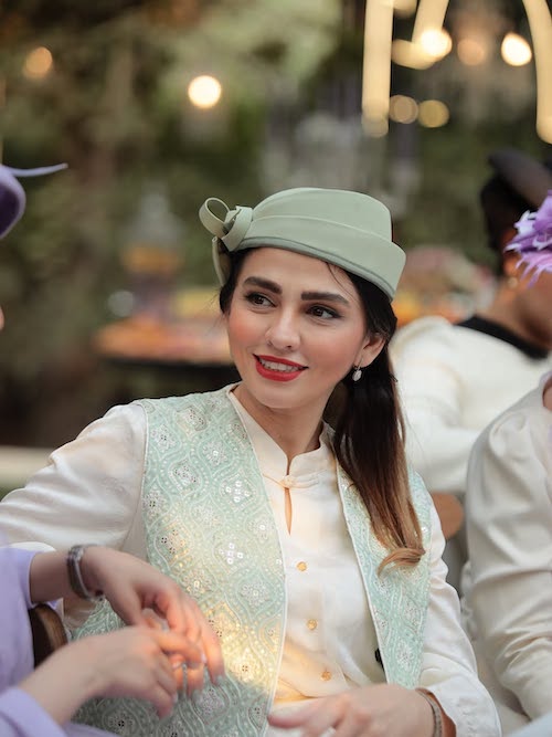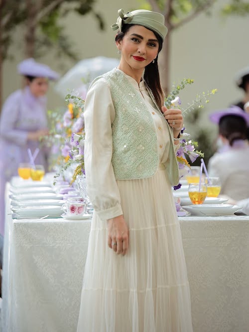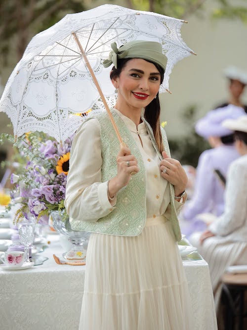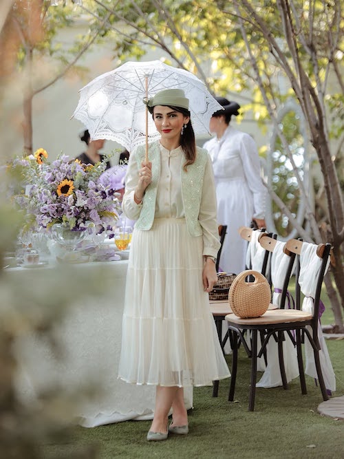 کلاه سبزرنگ و هماهنگ با جلیقه در کنار کفش فلت همرنگ، به همراه کیف حصیری و چتر دانتل سفید، تکمیلکنندهی این ترکیب جذاب بودند که گویی از دل رمانهای کلاسیک و کوچههای قدیمی لندن برگرفته شده است. این استایل نهتنها حس نوستالژیک و لطیفی را منتقل کرد، بلکه نشاندهندهی سلیقهی دقیق و ظریف سیما خضرآبادی در انتخاب لباس است که به خوبی بین سبکهای معاصر و کلاسیک تعادل برقرار میکند. چنین تیپی، او را به چهرهای شاخص و الهامبخش در فضای مد ایران تبدیل میکند.