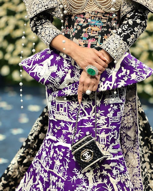 در بخش اصلی و مرکز توجه این لباس، دامن ماهی و فرمگرفتهای قرار گرفته بود که نقشهای روی آن از ساریهای قدیمی گرفته و بازطراحی شده بود. قسمتی از این طرحها، برگرفته از میراثی صدساله از آرشیو برند هندی بود که طرح آن بازآفرینی شده و سطحش با نخهای ابریشمی و سوزندوزیشده، همچون تابلویی ظریف، نمایانگر نسلها مهارت و هنر دستی بود.