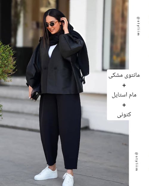 ۲. کت مشکی با شلوار ماماستایل و کتانی