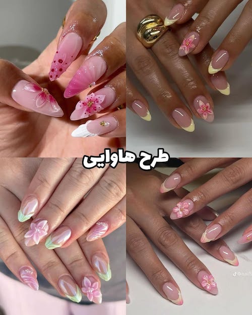 این طرحها با الهام از طبیعت گرمسیری هاوایی، پر از گلهای بزرگ، برگهای نخل، آناناس، درخت نارگیل و رنگهای روشن مانند فیروزهای، صورتی فوشیا و زرد خورشیدی هستند. ناخنهایی با این طرحها حس تعطیلات، ساحل و نسیم دریا را به بیننده منتقل میکنند و برای سفرهای تابستانی یا مهمانیهای ساحلی ایدهآلند.