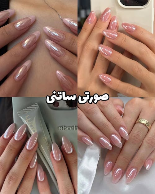 نه براق و نه کاملاً مات؛ صورتی ساتنی در حد تعادل، براقیتی ملایم شبیه پارچههای ساتن دارد. این رنگ یکی از شیکترین انتخابهای تابستانی است که حس لطافت، زنانهبودن و کلاس را در کنار هم منتقل میکند. میتوانید آن را به تنهایی استفاده کنید یا با طراحیهای فلزی طلایی و سفید ترکیب نمایید.