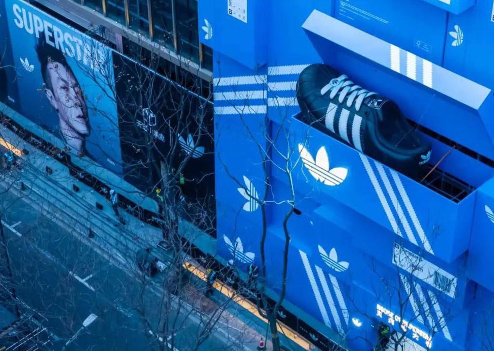 دکوراسیون این ساختمان به گونهای طراحی شده که شبیه به یک جعبه کفش غولپیکر است. رنگ غالب آن آبی است و با نوارهای سفید نمادین «آدیداس» تزئین شده است. لوگوی برند به شکل درخشانی در چندین نقطه از نمای ساختمان دیده میشود که حس مدرن و جذابی را به فضا میبخشد.