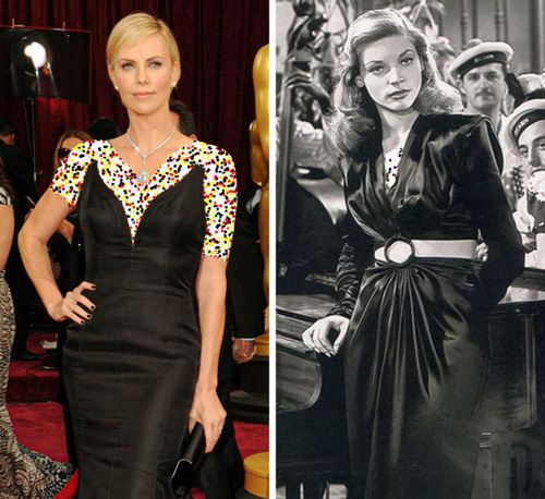شارلیز ثرون با استایل زنانه و قدرتمند خود، شباهت زیادی به لورن باکال دارد. هر دو با شروع بهعنوان مدل و سپس ورود به هالیوود، استایلی بینقص و جذاب دارند. شارلیز بارها لوکهای ماندگار لورن را بازسازی کردهاست.