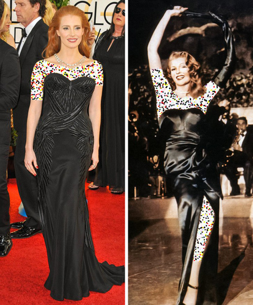با موهای قرمز موجدار و لباس مشکی بدون بند به همراه جواهرات الماس، جسیکا چستین استایل کلاسیک ریتا هیورث را زنده کرد و بسیار مورد توجه قرار گرفت.