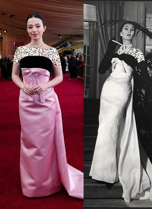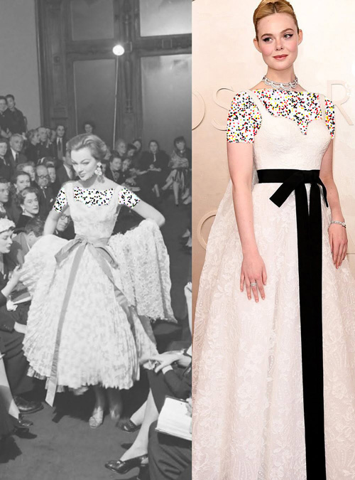 ال فانینگ، بازیگر جوان و حرفهای هالیوود نیز با پیراهنی بازسازیشده از آرشیو برند «ژیوانشی» روی فرش قرمز آمد. این پیراهن دنبالهدار که از تور طرحدار سفید دوخته شده بود و دامنی حجیم داشت، با پاپیونهایی مشکیرنگ در جلوی بدن و در قسمت کمر تزئین میشد.