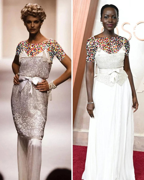لوپیتا نیونگو، ستارهی مشهور سینما، انتخابی جسورانه داشت و با پیراهنی سفارشی از بندهای مرواریدی «شنل» که از مجموعه اوت کوتور بهار ۱۹۹۱ الهام گرفته شده بود، چشمها را خیره کرد. لباس عاجیرنگ او با مهرههای کریستالی نقرهای، مرواریدهای درخشان و کمربندی از ساتن تکمیل شده بود. او همچنین رشتههایی از مروارید را در شینیون خود به کار برده بود.