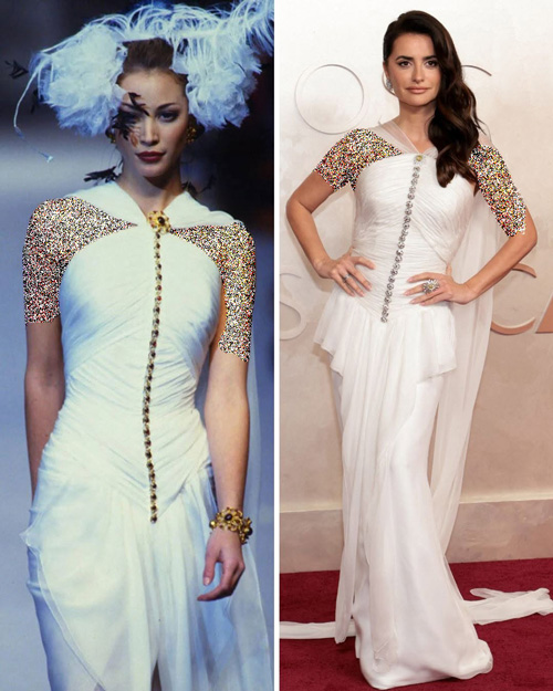 پنهلوپه کروز که رابطهای طولانی با «شنل» دارد، بالاخره لحظهای درخشان را در این همکاری رقم زد. او با لباس ابریشمی سفید سفارشی که با دکمههای نگیندار تزئین شده بود، یادآور ظرافت قدیمی هالیوود شد. این طراحی از مجموعهی فاخر بهار ۱۹۹۲ برند «شنل» الهام گرفته شده بود و یکی از ماندگارترین ظاهرهای اسکاری او را رقم زد.