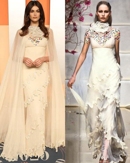 کایا گربر، نپومدل مشهور آمریکایی و از چهرههای مشهور دنیای فشن، با پیراهنی بازسازی شده از برند «ولنتینو» روی فرش قرمز مهمانی پس از اسکار به میزبانی مجلهی «ونیتی فر» حاضر شد. کایا که از طرفداران لباسهای قدیمی است، اینبار پیراهنی نباتیرنگ و ماکسی با دامنی دارای چینهای طبقهای را به تن داشت که با شنلی حریر به همان رنگ کامل شده بود.